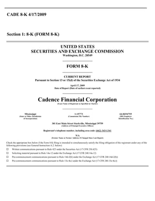 Q1 2009 Earning Report Of Cadence Financial Corporation